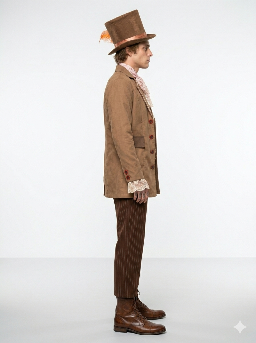 Descrição: Entre no mundo da fantasia com a nossa fantasia de Chapeleiro Maluco! 🍄 Este traje completo inclui o icônico chapéu de topo alto com detalhes em tule, casaco marrom com punhos de renda, colete estampado e calças bufantes roxas. Perfeita para festas à fantasia, Carnaval, eventos temáticos de Alice no País das Maravilhas e teatro. Garanta um visual autêntico, colorido e cheio de personalidade! ☕🎨