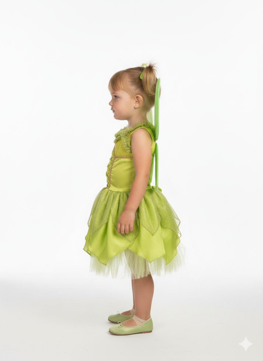 Descrição: Deixe a imaginação voar com a nossa Fantasia da Sininho (Tinker Bell)! Perfeita para festas de aniversário, Carnaval ou para brincar no Jardim Seletivo. O conjunto apresenta um corpete ajustável com detalhes em brilho, saia de tule em camadas no estilo "folha" e asas verdes removíveis super leves. Confortável e mágica, é o presente ideal para pequenas fadas que acreditam em pó de pirlimpimpim! 🌟💚
